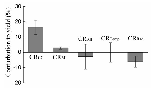 Fig.1. Contributions (%) of cultivar renewal (CRCC), new fertilization management (CRMI), all climatic variables (CRAll), temperature (CRTemp) and solar radiation (CRRad) to yield of winter wheat in the North China Plain for 1980-2009