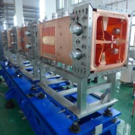 该腔体已于近日完成了整腔电场的调节和频率调谐,频率达到162.468MHz,场平整度达到±1.0%,对称度达到±1.25%。机械、真空和高频检测指标均达到设计要求。用于2.1MeV RFQ激励的连续波电子管功率源经过48小时140kW(运行所需功率)的无故障拷机实验,开环幅度稳定度和相位稳定度均达到设计要求。