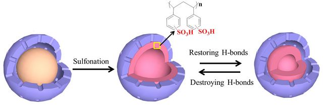 杨启华带领的有机-无机杂化催化材料小组多年来在微/纳米反应器的合成和催化应用方面开展研究工作,在前期工作中实现了手性金属络合催化剂在纳米反应器中的封装,将均相和多相催化剂的优势有效结合,最近将这一思路拓展到固体酸催化剂的设计与合成中。将磺酸功能化的聚苯乙烯限域在纳米反应器内,通过超分子的自组装改变其聚集形态,从而实现了对固体酸酸密度和酸强度的有效调控。得到的固体酸催化剂在一系列重要的酸催化反应中表现出了高活性、高选择性和稳定性。
