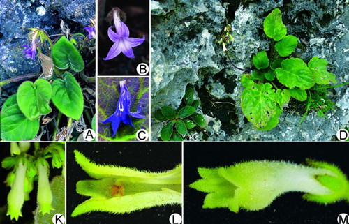 三新种照片(A—C. Petrocodon ainsliifolius, D—G. Petrocodon lithophilus, H—M. Petrocodon viridescens)