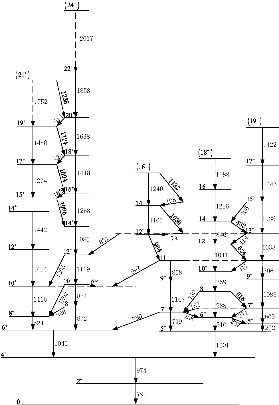 原子能院在束γ谱学组利用串列静电加速器提供的18O束流,通过重离子熔合蒸发反应70Zn(18O, 4n)84Sr布居了稳定核84Sr的高自旋态,并建立了84Sr的新能级纲图(见图1)。通过实验观测到正宇称转晕带14+以上呈现旋称参差现象,表明该核不再维持低自旋态时的近球形。