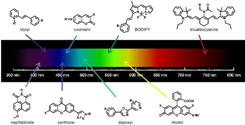DOFLA(Diversity-Oriented Fluorescent Library Approach)是一种基于组合化学发展起来的多样化-导向荧光分子库高通量筛选方法,它提供了一种快速、高效获取分析物荧光探针的途径。目前,DOFLA 化合物库拥有近万种荧光化合物,几乎覆盖了整个光谱范围(图1)。相对于传统的靶标-导向设计方法,这种方法在新型荧光探针的发展方面具有明显的优势:应用范围广泛,可检测的分析物种类多样、无偏见性;高通量,可以快速、高效地获得特定分析物的荧光探针。