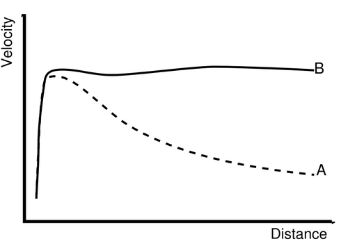 图1 虚线A:开普勒定律预测的漩涡星系的旋转曲线。实线B:实测的典型漩涡星系的旋转曲线。