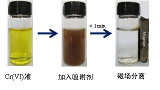 铬是一种重要的工业原料,在电镀、铬盐工业、染料生产及制革等行业中得到了广泛应用。但由此产生的大量含铬废水给人类和环境带来了巨大的危害。铬在水体中主要有三价铬(Cr(III))与六价铬(Cr(VI))两种存在形式。其中Cr(VI)具有强烈致癌和诱发基因突变的作用。因此,在Cr(VI)废水排放到自然界之前,必须进行脱除。吸附法作为一种简单高效、成本低廉的废水处理方法,已经引起了研究者们的广泛关注。但目前文献报道中的吸附剂中仍然存在着吸附容量低、吸附速率慢以及吸附剂回收困难等缺点。