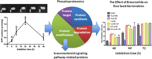 中国科学院武汉植物园资源植物繁殖生物学课题组博士研究生韩超在杨平仿研究员指导下,通过与日本国立作物研究所教授小松节子(Setsuko Komatsu)研究团队合作,利用阳离子亲和层析和非标记NanoLC-MS/MS质谱定量技术对水稻种子萌发早期阶段胚组织的磷酸化蛋白组进行系统研究,发现了油菜素内酯信号通路相应元件的磷酸化水平显著变化,并利用外源施加油菜素内酯的方法确认其在水稻种子萌发早期对萌发有明显的促进作用。