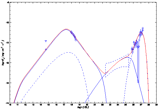 耀变体的辐射具有快速的光变和高偏振等特性,辐射谱呈双峰结构(如图所示),一个是低能峰,从射电到紫外或者X射线波段;另一个是高能成峰,从X射线到伽马射线波段。普遍认为耀变体的低能峰是由喷流中相对论电子的同步辐射产生,然而耀变体高能峰的起源目前仍然存在争议。