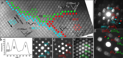 研究表明,原位拉伸加载时,在纯Mo中裂纹尖端处发生了bcc1→fcc→bcc2的相变,部分<001>bcc取向的晶粒(bcc1)通过fcc中间相转变到<111>bcc取向(bcc2),相当于晶格转动了54.7°。在拉伸应力卸载后,部分bcc2晶粒和fcc相逆转变回原始的bcc1晶粒。通过定量电子显微学分析,探测到拉伸应力加载时裂纹尖端的局部剪切应力达到约 8GPa,正是由于如此大的局部应力才驱动了bcc1→fcc的结构相变。这说明即使是bcc结构非常稳定的难熔金属Mo,当内部产生局部应力集中而其它变形方式又受到抑制时,也会产生结构相变。在塑性变形时,应力诱发相变可以部分地释放材料内部的应力集中,从而协调材料的变形,阻止微裂纹的萌生和扩展,最终为改善体心立方金属的塑性做出贡献。此外,bcc1→fcc→bcc2相变所对应的54.7°晶格转动也为金属变形时的晶粒扭转提供了一条新途径。