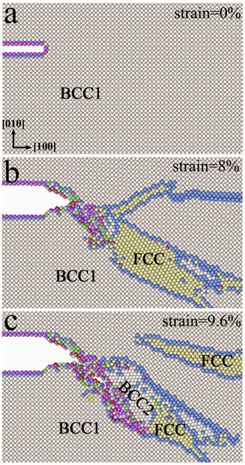 图1 纯Mo裂纹尖端的三种不同的晶体结构或取向。高分辨扫描透射电子显微像中,蓝色、红色和绿色的圆点分别标示出<001>-bcc1、<110>-fcc和<111>-bcc2取向的原子。
