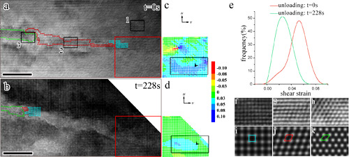 图3 应力卸载后裂纹尖端的晶体结构变化和定量应变分析。蓝色、红色和绿色圆点标记了bcc1 、fcc和bcc2相的原子。LADIA应变分析显示了伴随逆相变的应力释放。