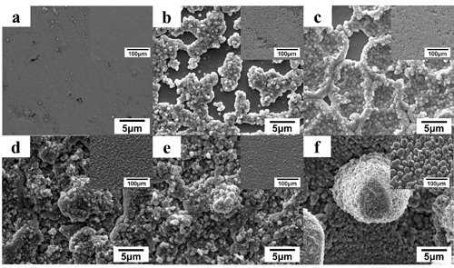 不同沉积时间对Ni-P合金薄膜表面形貌的影响的扫描电子显微镜照片。(a-f依次为 1 min、5 min、10 min、20 min、30 min、60 min的低放大倍数图片显示薄膜沉积的均匀性)