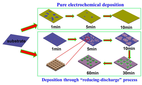 最近,该课题组对这一共沉积形貌的变化规律进行了更进一步的研究,对薄膜形貌的变化机理有了更深入的认识。他们通过对不同沉积时间下薄膜形貌和元素成分等信息的观察,认为薄膜形貌的产生是通过还原-放电过程(reducing-discharging process)来生长的。即薄膜在初始阶段,会有通过还原剂还原形成的纳米级颗粒零散分布在基底薄膜表面,使得平整的基底/沉积表面首次出现了一定的纳米级的粗糙度。根据尖端放电原理,由于表面变得更加粗糙,粗糙度比较大的颗粒曲率比较大,表面电荷分布比较集中电流密度偏大,电沉积速度比较快。这样就造成了沉积速率在基底表面的不均匀,直接引起了之后表面形貌的产生。