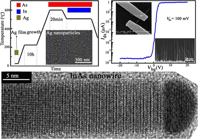 赵建华研究员及博士生潘东等采用分子束外延技术首次在Si衬底上成功地生长出高质量纯相超细InAs纳米线。他们利用Ag做催化剂,发展了两步催化剂退火方法,即先对催化剂进行长时间的低温退火再进行高温退火。采用这种方法可以得到直径均一的Ag催化剂颗粒,从而可以在Si(111)衬底上大面积生长出垂直于衬底表面的InAs纳米线。这种纳米线直径均为10nm左右,为纯纤锌矿结构,纳米线中不存在孪晶和层错缺陷。北京大学教授陈清研究组利用这种纯相超细InAs纳米线制成MOSFET,这种场效应晶体管的开关比达到百万量级,是迄今报道的InAs纳米线平面器件的最大开关比。