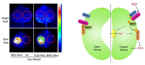 中国科学院遗传与发育生物学研究所周俭民实验室通过生化和生理学实验揭示,BIK1正调控flg22诱导的钙离子细胞内流,RbohD与免疫受体形成复合体参与免疫反应的调节,BIK1和RbohD直接相互作用并且flg22可以诱导RbohD发生磷酸化并且从免疫受体复合体上解离,进一步研究发现RbohD作为BIK1的底物,RbohD的S39,S343,S347位点能够被BIK1磷酸化,并且S39的磷酸化并不依赖于钙离子,并验证了这些位点的磷酸化对RbohD蛋白的生物学功能(ROS的爆发和气孔抗性)的重要性。