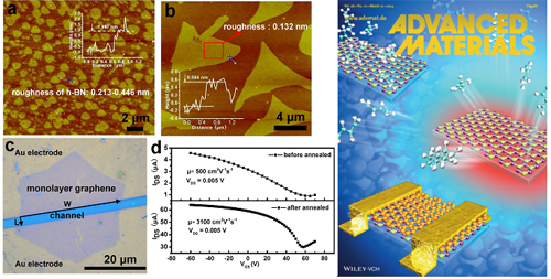 目前对于h-BN的制备主要是采用化学气相沉积的方法(CVD),存在的主要问题是制备过程中单片h-BN的尺寸较小,从而增加了薄膜的晶界,降低了薄膜的质量,同时在石墨烯和h-BN界面处存留杂质的存在也降低了其作为介电层在石墨烯场效应器件中的性能。针对这些问题,化学所有机固体重点实验室相关研究人员与哈工大胡平安教授合作,采用CVD的方法制备得到了20μm大小的单片三角形的h-BN(图2左上),进一步生长得到连续的薄膜,从而降低薄膜的晶界,提高了薄膜的质量。由于h-BN较高的稳定性和抗氧化性能,对利用聚甲基丙烯酸甲酯辅助转移到二氧化硅/硅基底上的薄膜,在空气中热处理除去转移过程中的残留物,得到了表面干净的h-BN薄膜。由其组装成石墨烯的场效应器件(图2左下),迁移率比不经过热处理的器件提高了6倍。该研究成果发表在《先进材料》上(Adv. Mater., 2014, 26, 1559-1564),并被选为内封面(图2右)。