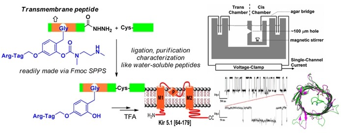 离子通道蛋白能调节细胞内外离子平衡并产生细胞膜动作电位,是在病毒侵染、神经系统、心血管系统、生殖系统等生理活动中起着关键作用的一类膜蛋白。有关离子通道的核磁共振研究不仅需要较纯的膜蛋白、还需要在合适的位点进行同位素标记。刘磊研究组和田长麟研究组合作发展和应用Fmoc化学新方法实现了毫克级离子通道蛋白的合成,并成功应用单分子通道方法鉴定了化学全合成的离子通道的功能。化学合成的膜蛋白将为生物化学和生物物理学研究提供其他方法难以获得的实验材料。