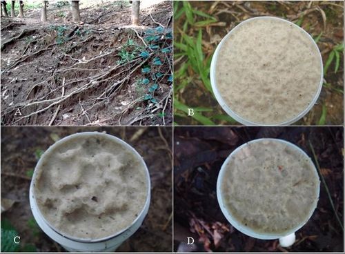 橡胶林小斜坡上的溅蚀状况(A)及裸地(B)、橡胶林(C)、热带雨林(D)内的雨滴溅蚀力比较