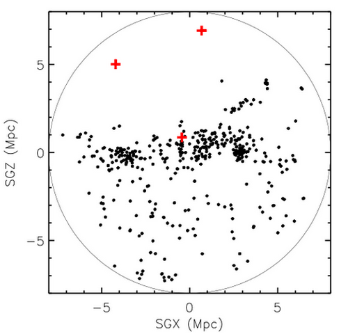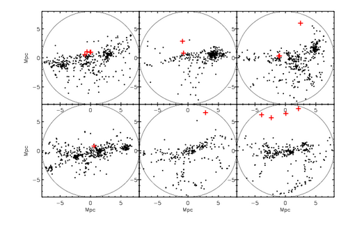 上两图为银河系近邻星系分布的投影图。上图为观测中的本地星系群星系分布;下图给出6个数值模拟类本地星系群星系分布。图中每一个黑点代表一个星系,红色的十字代表空洞物理空间中实际星系。