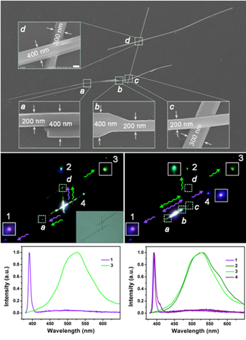 光信号在纳米线中的传输主要依赖于纳米线腔体对光的限域能力,不同直径的纳米线可以限域不同波长的光信号。每个特定波长的光信号都有相应的截止直径,在低于此截止直径的波导通道中,光信号便不能继续传播。该实验室科研人员通过两步法气相合成氧化锌纳米线同质结,并且通过操纵单根纳米线同质结,构筑纳米线光子回路,实现了紫光和绿光信号的分离和传输。进而集成多个同质结和交叉结,成功构筑了多通道的光学分波器。该成果被邀请作为当期的内封面文章(图2)。