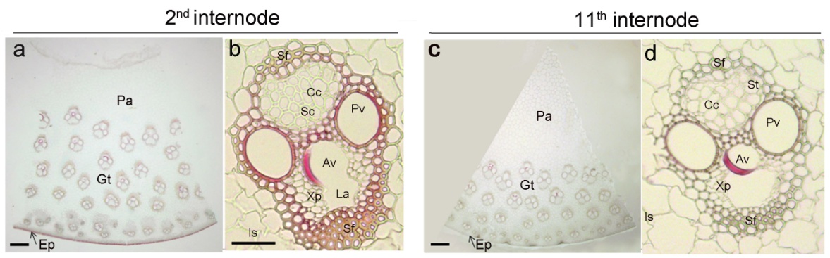 周功克等在研究中发现,结晶化纤维素与木糖是南荻茎细胞中分布最广的多糖,两者在除韧皮部之外的区域均有大量分布,且在不同发育时期的茎中具有相似的分布特点。韧皮部主要存在的多糖是木葡聚糖。而果胶质多糖则在南荻的茎细胞中,尤其是维管束区域,其分布呈现多样性。该研究同时鉴定到长链阿拉伯聚糖、半乳糖醛酸、岩藻化木葡聚糖等在不同发育时期的茎中分布形式具有很大差异。