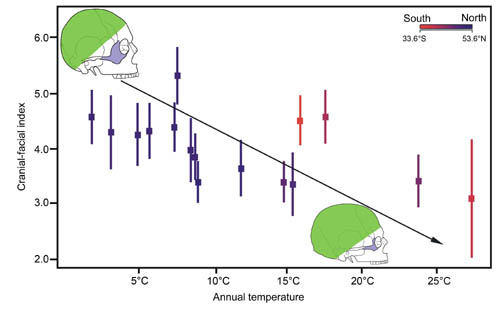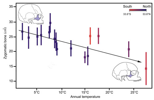 为探讨人类的体质特征与环境之间的关系,潘雷等选取亚洲、非洲、欧洲、美洲和大洋洲18个考古遗址出土的295例现代人头骨为研究材料,利用3D激光扫描技术,获取脑颅的头盖部和面颅的颧骨部分的表面积,对不同纬度人群头面部大小的变化规律及与年均温度的相关性进行了分析。研究结果显示:人类头面部的形态特征具有适应性,现代人群头面部表面积在全球范围内有纬度性变化,也与当地温度有密切联系;头盖部的面积与纬度呈明显正相关,与温度呈明显负相关;颧骨面积和头颧指数(颧骨面积/头盖部面积)与温度呈明显负相关,与纬度没有显著的相关性。随着纬度的升高,头盖部面积明显增大;随着年均温度的升高,头盖部和颧骨的面积及头颧指数有显著减小的趋势。