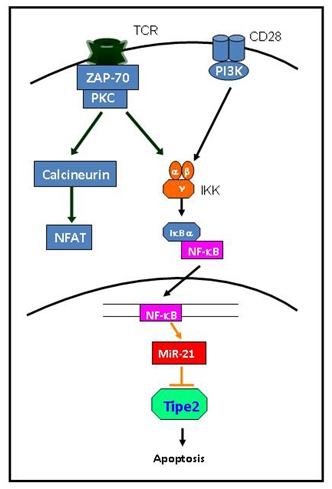 图1 NF-kB通过miR-21–Tipe2轴抑制活化诱导的T细胞凋亡。TCR和抗CD28抗体通过IKK刺激NF-kB的活化(通过降解抑制蛋白IkB)。活化后NF-kB转移到细胞核内并启动目标基因,包括miR-21。MiR-21通过降解Tipe2从而抑制活化诱导的T细胞凋亡。