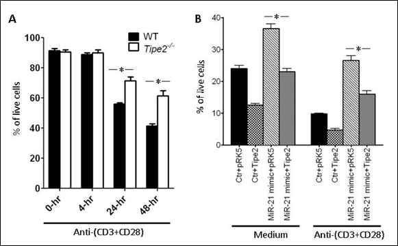 图3 miR-21通过Tipe2调控T细胞凋亡。(A)从WT和Tipe2 -/- 小鼠(n=3)分离脾初始CD4+T 细胞并分别用板结合的抗CD3抗体 (1mg/ml)和可溶性抗CD28抗体(1mg/ml)处理或不处理。细胞用annexin V 和7AAD染色,通过流式细胞术分析细胞凋亡的程度。 (B) 用miR-21相似物或阴性对照与Tipe2过表达的载体或空载体共转染EL4细胞。24h以后,分别用板结合的抗CD3抗体 (1mg/ml)和可溶性抗CD28抗体(1mg/ml)处理或不处理,细胞用annexin V 和7AAD染色,通过流式细胞术分析细胞凋亡的程度。*P<0.01。以上数据代表三次独立实验。