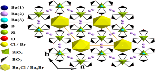 硼硅酸盐因其潜在的应用性能以及丰富的结构类型而引起广泛关注,近年来,有研究报道了一些性能良好的硼硅酸盐非线性光学晶体,但硼硅酸盐体系粘度大,其主要产物仍是玻璃和矿物,因此,在硼硅酸盐体系探索晶体有很大空间。中国科学院新疆理化技术研究所研究员潘世烈带领其团队引入卤素离子X (X = Cl, Br)降低硼硅酸盐体系粘度,同时形成了XBa6极性离子盐单元作为极性模板,极性单元的引入对形成不对称中心的结构有利,成功合成出两种Ba4(BO3)3(SiO4)·Ba3X离子盐化合物。该类化合物是目前第一例具有非线性光学效应的碱土金属卤素硼硅酸盐,它们是同成分熔融化合物且具有高的热稳定性,这为大尺寸单晶的工业应用提供了可能,同时该类化合物紫外截止边均低于190nm,是一种潜在的深紫外非线性光学材料。此项研究工作丰富了硼硅酸盐体系,同时也为设计和合成新型紫外非线性光学材料带来新思路。