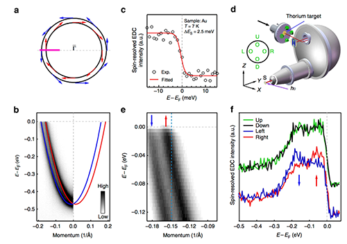 图1 自主研发的真空紫外激光自旋分辨/角分辨光电子能谱系统的优越性能。c图显示的最好自旋能量分辨率为2.5meV,为国际上迄今为止最高自旋能量分辨结果。对标准样品Au(111)表面态的Rashba劈裂测量结果,展示了系统在自旋模式下的优异动量分辨和能量分辨性能。