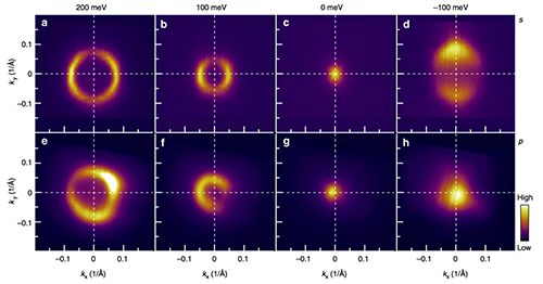 图2 拓扑绝缘体Bi2Se3表面态在不同偏振条件下测量的上、下Dirac锥的等能面谱重分布。上半部分(a-d)为s偏振条件下的测量结果,下半部分(e-h)为p偏振下测量的结果。