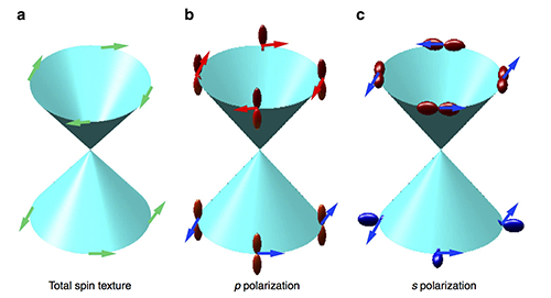 图3 拓扑绝缘体Bi2Se3表面态电子在不同偏振条件下对应的p轨道结构以及基于理论预测的相应自旋结构示意图。a为总自旋结构,即与p轨道x,y,z全部三个分量相应的总自旋结构;b为p偏振下对应的p轨道结构与相应的自旋结构;c为s偏振下对应的p轨道结构和相应的自旋结构。