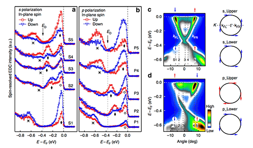 图4 在s偏振和p偏振测量条件下,自旋分辨角分辨光电子能谱直接测量的Bi2Se3拓扑绝缘体表面态上、下Dirac锥电子对应的自旋结构。