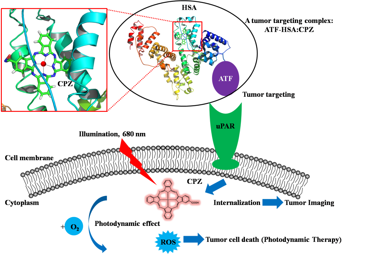 在国家自然科学基金、福建省自然科学基金等项目的支持下,中国科学院福建物质结构研究所结构化学国家重点实验室黄明东课题组和陈学元课题组在结构生物学、光动力学、生物光学领域长期研究积累基础上,利用基因重组技术,构建了一种新型的具有肿瘤靶向性的融合蛋白药物载体。该药物载体能够靶向到尿激酶受体(uPAR)高水平表达的恶性肿瘤,同时该药物载体含有人血清白蛋白(HSA),能够装载药物分子,从而使得药物分子对肿瘤具有靶向作用。相关研究成果已发表在实验医学领域杂志上(Theranostics, 2014, 4, 642-659)。