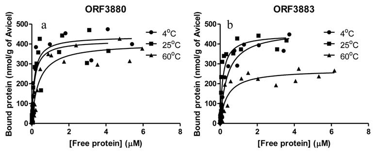 共培养体系糖苷水解酶酶活与纯培养菌株或人工混合的体系相比,提高2-6倍,表明这两株菌在生长过程中形成了水解木质纤维素的最佳酶配比。定量检测各个生长时期两菌株的细胞数目发现,在指数生长早期和中期菌株CS-3-2占优势,到指数生长末期菌株CS-4-4的细胞数目才超过菌株CS-3-2,而共培养体系的最佳酶活也在这个时期检测到。活性染色图谱(图1)表明菌株CS-4-4的谱图与共培养体系谱图相似,但酶活显著提高。在这些谱带中,有两个含量最丰富的水解酶ORF3880和ORF3883。其中,ORF3880含多达5个CBM(Carbohydrate-Binding Module,碳水化合物底物结合模块),对底物吸附能力几乎不受温度影响(图2),揭示了高温微生物获取不溶碳源底物——纤维素的特殊机制。