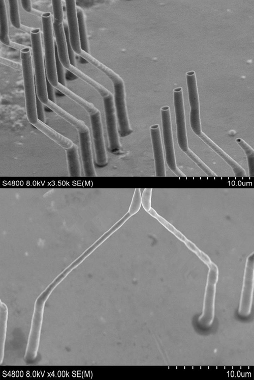 为了便于实现材料和器件在微纳尺寸下的合成或组装,实现其高度集成化和多功能化,中国科学院宁波材料技术与工程研究所许高杰研究团队利用自行研制的三维微纳结构制造系统,成功制备出不受模板限制的三维方向具有一定取向性的曲线型结构,并实现了不同节点间的互联互通,该技术对于提升大规模集成电路向三维立体方向发展(集成度)有重要意义。