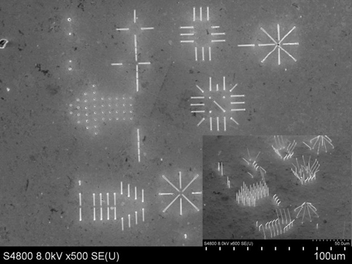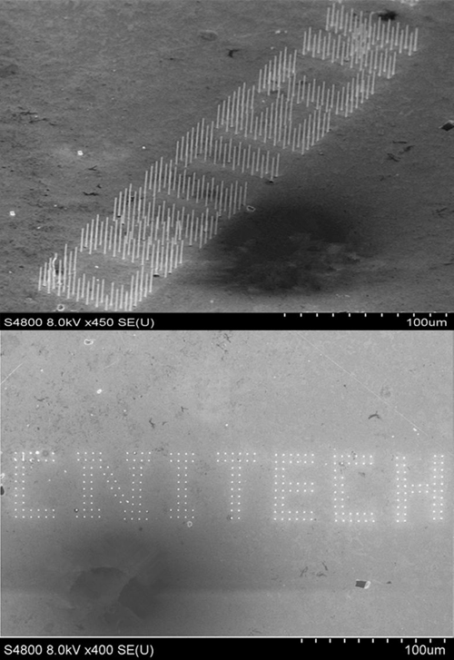 上图为微纳线组成的中科院宁波工业技术研究院(CNITECH)英文缩写的阵列图样。下图为垂直俯视的SEM照片,每个亮点都是一根垂直的微纳线。