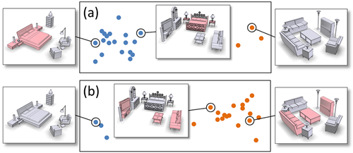 入选论文二是博士后徐凯和黄惠研究员等人的Organizing Heterogeneous Scene Collection through Contextual Focal Points(《基于上下文相关聚焦点的场景异构数据集的有效组织》),该文为三维室内场景的规划和组织提供了标准。