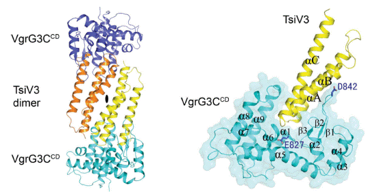 霍乱弧菌是引起烈性肠道传染病霍乱的病原菌,曾在世界范围内爆发过数次大流行,夺去了数百万人的生命。现在,霍乱在世界某些地区仍然流行,也是过去细菌战的主要帮凶。霍乱弧菌具有典型的VI分泌系统,三种VgrG蛋白(VgrG1-3)围成三聚体形成VI分泌系统底部及针尖状结构。霍乱弧菌的VgrG3毒性酶能够水解细菌细胞壁的肽聚糖,发挥其裂解细菌活性。VgrG3蛋白C端含有肽聚糖结合区域(VgrG3PGB)和催化区域(VgrG3CD),它的酶活性能被其对应的免疫蛋白TsiV3所抑制。TsiV3基因缺失导致霍乱弧菌被同类杀死,丧失自我保护的能力,并且严重损害霍乱弧菌的致病能力。为了阐释VI型分泌系统的结构基础,研究团队获得了VgrG3CD与TsiV3蛋白复合物的晶体,解析了TsiV3与VgrG3酶活结构域(VgrG3CD)复合物的高分辨率(2.3埃)的晶体结构。结构分析显示,TsiV3与VgrG3CD通过4个相互作用界面形成了紧密的相互作用,通过一系列的点突变,发现Gln91和Arg92形成的第一个作用界面对VgrG3CD-TsiV3复合物的形成最为重要。研究团队进一步发现,TsiV3以稳定的双体形式存在,单体的TsiV3丧失了抑制活性,表明TsiV3的二聚化对于其发挥免疫蛋白的作用是必须的。该研究工作揭示了霍乱弧菌关键免疫蛋白行驶免疫保护功能的结构基础,为霍乱弧菌的防治提供了新靶点和新策略。