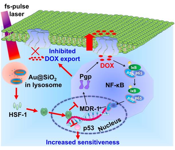 最近,国家纳米科学中心陈春英课题组与吴晓春课题组合作,在逆转肿瘤耐药性方面取得新进展。利用二氧化硅包覆金纳米棒(Au@SiO2)的可控光热效应逆转了肿瘤细胞的耐药性。发现用低于光热治疗强度的飞秒脉冲激光照射摄入Au@SiO2的耐药细胞产生了独特的光热效应,可诱导细胞内热休克因子(HSF-1)表达、三聚体化、入核、抑制NF-kB通路,既能高效抑制细胞膜上药物输出泵蛋白(P-glycoprotein,Pgp)的表达,增加细胞内化疗药物蓄积;又能成功诱导耐药细胞内突变p53蛋白的降解,对化疗药物增敏,最终有效克服肿瘤耐药(图1)。而传统的水浴热刺激不能克服肿瘤耐药,表明微小空间内局部热刺激的重要性。相研究结果发表于《先进功能材料》(Adv.Funct.Mater.2014, DOI:10.1002/adfm.201400015)。文章被审稿人高度评价,认为应该作为VIP文章加快发表 。