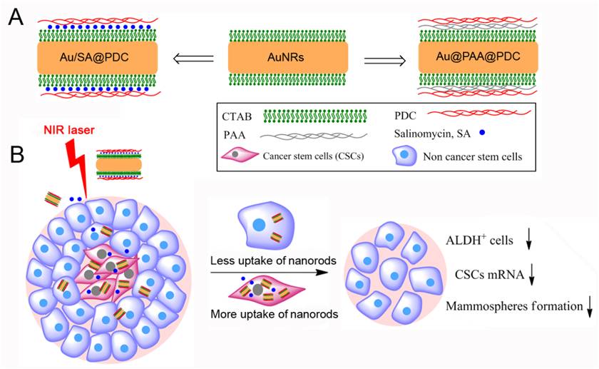 肿瘤干细胞对传统化疗和放疗均高度耐受,难以清除,是诱导肿瘤复发和转移的重要因素。消除肿瘤干细胞是肿瘤治疗面临的重大难题。利用金纳米棒(AuNRs)的光热效应处理人乳腺癌细胞,发现其可选择性降低肿瘤干细胞比例和功能,同时干细胞标志物表达水平显著降低。推测主要是由于肿瘤干细胞比正常肿瘤细胞短时间内可摄取更多的AuNRs,因而产生更强的光热效应。进一步用AuNRs载带肿瘤干细胞抑制剂盐霉素(SA),利用激光照射使其在细胞内缓慢释药,针对肿瘤干细胞进行热、化疗联合治疗(图2),进一步降低肿瘤干细胞的比例和功能。该体系提出了一种以肿瘤干细胞为靶点的治疗方法,有助于提高肿瘤治疗的效果并抑制肿瘤的复发。该工作近期发表于《生物材料》(Biomaterials, 2014, 35: 4667-4677)。