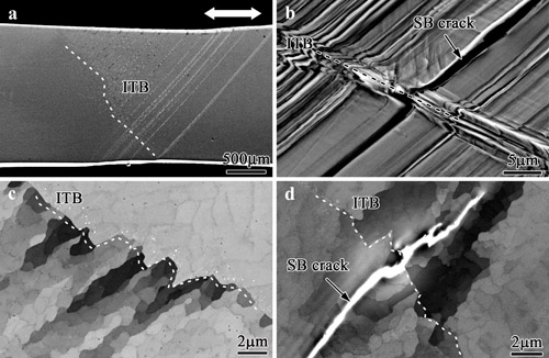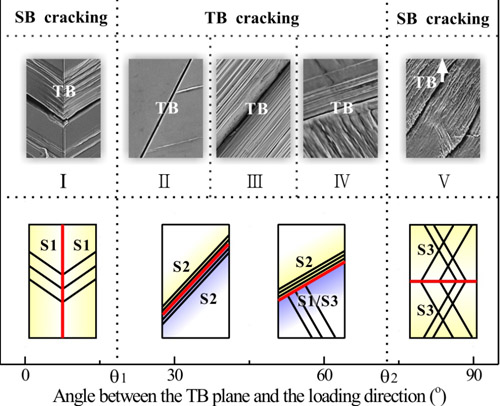 图2 孪晶界与应力轴呈不同倾角时双晶孪晶界面的疲劳开裂行为:孪晶界与应力轴夹角在45度上下时发生孪晶界开裂,而在0度和90度附近时发生滑移带开裂。