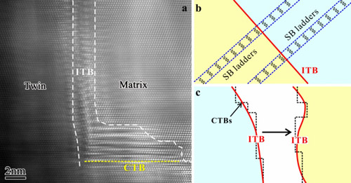 图4 非共格孪晶界的高分辨率像。(a)及两种塑性变形机制示意;(b)位错贯穿机制;(c)非共格孪晶界迁移机制。