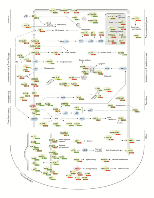 基于AD脑部转录组数据筛选出的前100个高频率的失调基因。每个基因在四个主要数据集中的扰动状况由基因ID下方的颜色条给出(红色表示上调,绿色表示下调,黄色表示混合扰动,灰色表示没有变化)。筛选出的100个基因用浅绿色标出,其它相关的重要基因也被加入图中来增强功能上的联系。