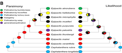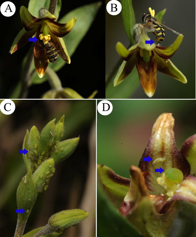 兰科植物欺骗性传粉的起源长期以来是困扰进化生物学家的难题之一。产卵地拟态是一类兰花利用雌性昆虫的产卵行为,在形态和气味上拟态昆虫的产卵地,从视觉、嗅觉和触觉等方面吸引昆虫产卵,从而实现传粉的拟态方式。对疏花火烧兰(Epipacits veratrifolia)分布在地中海的居群研究认为,该兰花拟态蚜虫气味,吸引取食蚜虫的雌性食蚜蝇到花上产卵并传粉,这是一种拟态蚜虫感染的产卵地拟态模式。然而,在这种拟态系统中,兰花的拟态模型是蚜虫感染其它同域分布的植物,还是拟态蚜虫对兰花自身的感染机制尚不清楚。