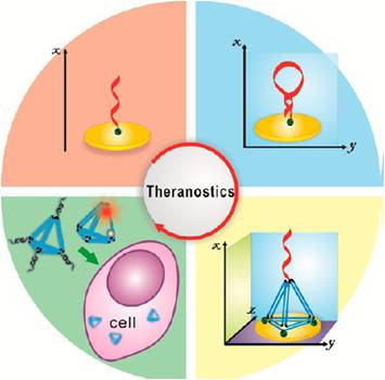 生物分子探针在传感界面上的组装过程很大程度上决定了生物传感检测的性能。如何调控生物分子在界面上的密度和取向,减少生物分子与界面的非特异性吸附并避免界面分子间的侧向作用力则已成为该领域的挑战性问题之一。针对这一问题,樊春海课题组对DNA分子在宏观和纳米界面上的组装过程进行了系统研究。由于DNA是一种软物质,常规使用的一维单链探针容易产生链间纠缠而聚集。2003年发展出了具有一定刚性的二维结构DNA探针,在一定程度上解决了这一问题(Fan et al. PNAS 2003, 100, 9134) ,并在DNA和核酸适配体检测方面展现出明显的优越性。近年来,通过引入DNA纳米技术发展出刚性的三维结构DNA探针,实现了DNA探针之间距离的精确调控。这为构筑有序的生物分子界面提供了新的途径,提高了界面生物识别能力,进而显著提升了生物传感器的检测能力。在这一新型生物传感平台上深入研究了界面识别和电子传递等物理化学机制,并实现了核酸、抗原和小分子的超高灵敏检测,相关结果相继在JACS, Angew. Chem.,Adv. Mater., Sci. Rep.等杂志发表。