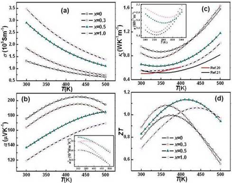 基于半导体材料的塞贝克效应或帕尔贴效应可实现热能与电能直接相互转换,包括热电制冷和热电发电两种应用形式。热电制冷器件具有结构紧凑、无噪声、无磨损、无泄漏等特点,已广泛应用于局部冷却或温度控制;热电发电器件可为无人区信号发射装置、深空探测器、植入式医疗器械等提供电源,更重要的是可以作为一种实现余热能量回收、降低能源消耗的新型发电方式。对于热电转换技术的更大规模应用,目前所存在的关键问题是能量转换效率较低,而这主要取决于材料的热电性能,其表征参数为无量纲ZT值。