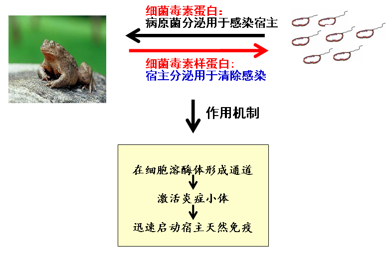 中国科学院昆明动物研究所动物模型与人类疾病机理重点实验室生物毒素与人类疾病课题组在张云研究员带领下,从两栖动物大蹼铃蟾(Bombina maxima)中分离和克隆了第一个细菌毒素样蛋白和三叶因子复合物betagamma-CAT(发明专利授权号ZL200810058028.5),该课题组向阳和严超等进一步深入揭示了该蛋白质复合物的表达调控与微生物感染密切相关,动物体内模型证明其具有清除细菌,保护动物免受致命感染的功能。与现在已知的微生物识别Toll样受体(Toll-like receptors)通路不同,betagamma-CAT的作用机制在于通过宿主细胞受体介导的该蛋白复合物内吞,溶酶体膜寡聚化及通道形成,造成细胞炎症小体(inflammasome)的激活,进而迅速而有效地激发体内天然免疫响应清除体内微生物的感染。