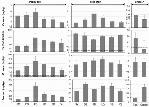 重金属沿“土壤—大米—鸡”食物链迁移与累积。(虚线分别为国家土壤环境质量二级标准和国家食品卫生标准)