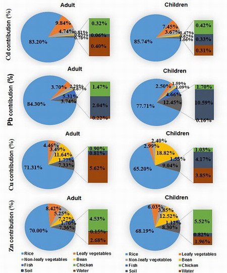 中国科学院华南植物园生态及环境科学研究中心庄萍博士等科研人员通过多年的监测分析,比较了饮用水、土壤无意摄取和食物摄取等多种暴露方式,结果发现,食物摄入是危害矿区居民健康的最主要途径。污染土壤中重金属铅和镉经过食物链(农田土—稻米—鸡、菜园土—蔬菜/豆类、淤泥—杂草—鱼)传递,在大米、蔬菜、鱼肉、鸡肉中均有一定量的累积,一半以上样品镉和铅含量超过国家卫生标准。矿区周边成人和儿童通过食物途径摄入重金属的总目标危险系数THQ达到10.2和11.1(THQ大于1即存在健康风险),食物中重金属污染使当地居民面临巨大的健康风险,在多种暴露因子中,大米重金属铅和镉的危害贡献率超过了七成以上,成为当地居民暴露重金属的最大风险源,推断重金属污染是当地居民癌症高发的主要诱因之一。