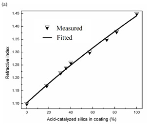 目前,团队正致力于第三代具有封闭孔隙的纳米宽光谱减反膜研究。单层减反膜在300-1200纳米波长光谱加权平均透过率已达97.34%,接近97.72%的理论极限,这一体系还具有显著的防雾效果。以此为基础,通过折射率调控技术(在1.10-1.45之间),实现了更为复杂的多层准渐变光伏减反膜,在进一步提升宽光谱减反射效果的同时,实现了更好的耐候性。部分相关研究成果近期发表在ACS Appl. Mater. Interfaces 6, 1415 (2014)和J. Sol-gel Sci. Technol. DOI: 10.1007/s10971-014-3364-y上,且已获授权中国发明专利(CN20120097416)。这一进展为进一步提升减反膜的宽光谱、全向和长效减反特性及其在光伏和光电器件等领域的应用奠定了坚实的基础。