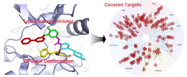 激酶当前被认为是抗肿瘤最重要的药物开发靶点之一,自2001年以来,美国食品药品监督管理局已经批准了23个靶向激酶的抗肿瘤药物。目前以激酶为靶点的药物按照它们结合位点的不同主要可以分为I型, II 型及III型三大类,其中I型类最为常见,主要靶向于活化状态的激酶;II型主要靶向于非活化状态(DFG-out)。自经典的II型药物格列维(Gleevec)上市后,针对此类药物的开发成为一个热点方向。根据结构分析,传统观点认为II型药物比I型药物特异性强,选择性更好。但是长久以来,II型药物是否比I型药物具有更高的选择性,有哪些激酶可以被II型的激酶药物打击一直是从事药物开发的科研人员高度关注的关键科学问题,但此前还未有详细系统的研究。